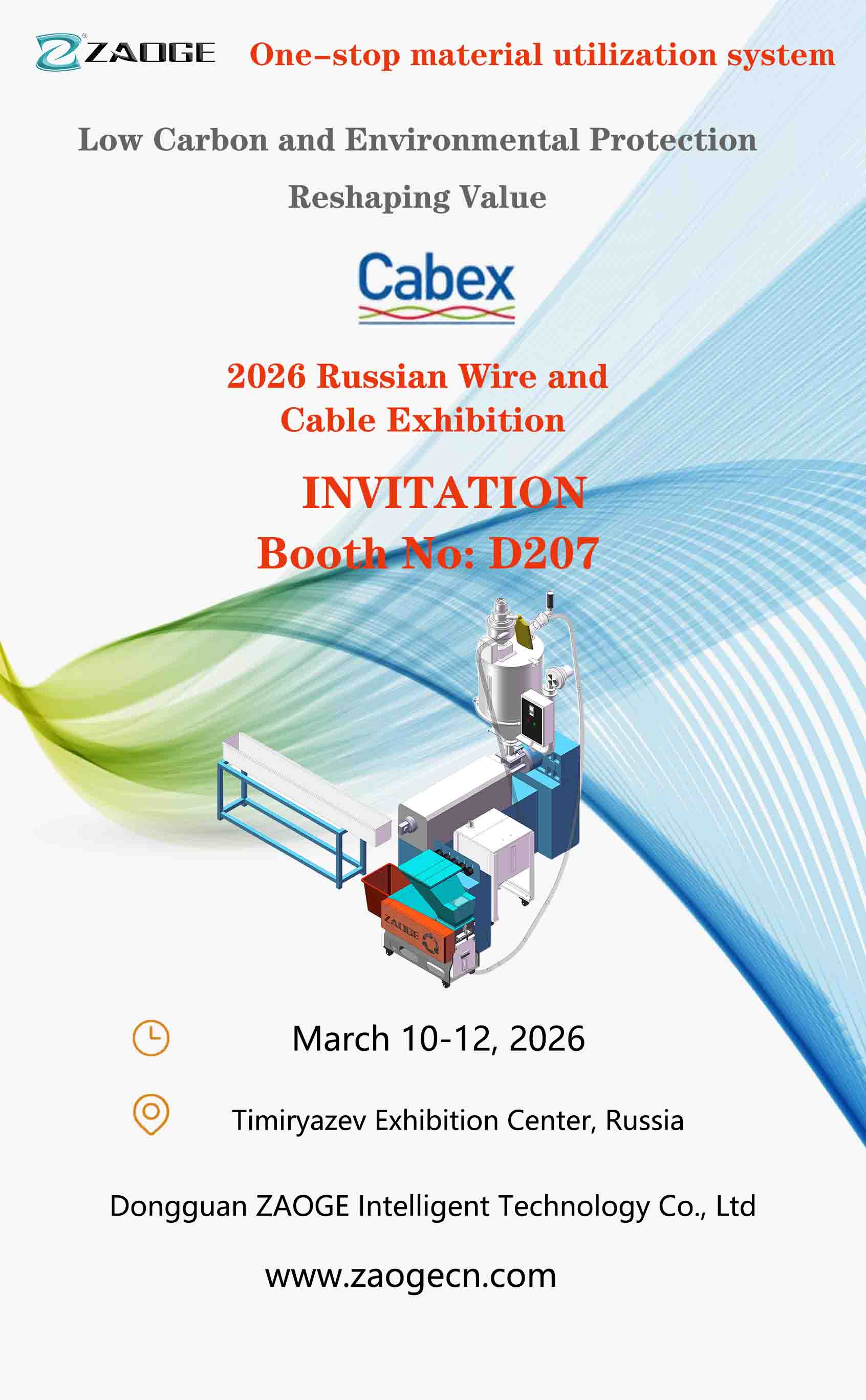 From March 10th to 12th, 2026, DongguanZAOGE Intelligent Technology Co., Ltd. will be showcasing its high-performance crushers and recycling systems at the 2026 Moscow Russian Wire & Cable Exhibition.