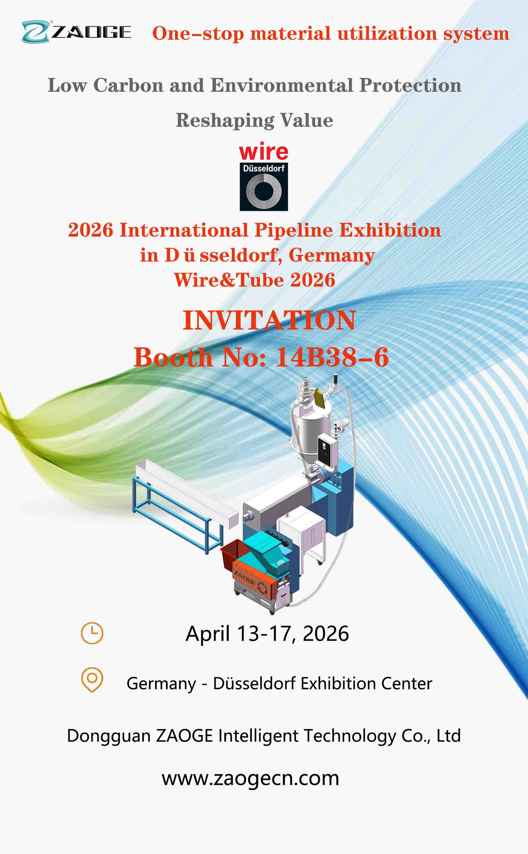 From April 13th to 17th, 2026, DongguanZAOGE Intelligent Technology Co., Ltd. will be showcasing the world’s leading metal and tube processing event – Wire & Tube 2026 in Düsseldorf. We sincerely invite you to visit and exchange ideas!